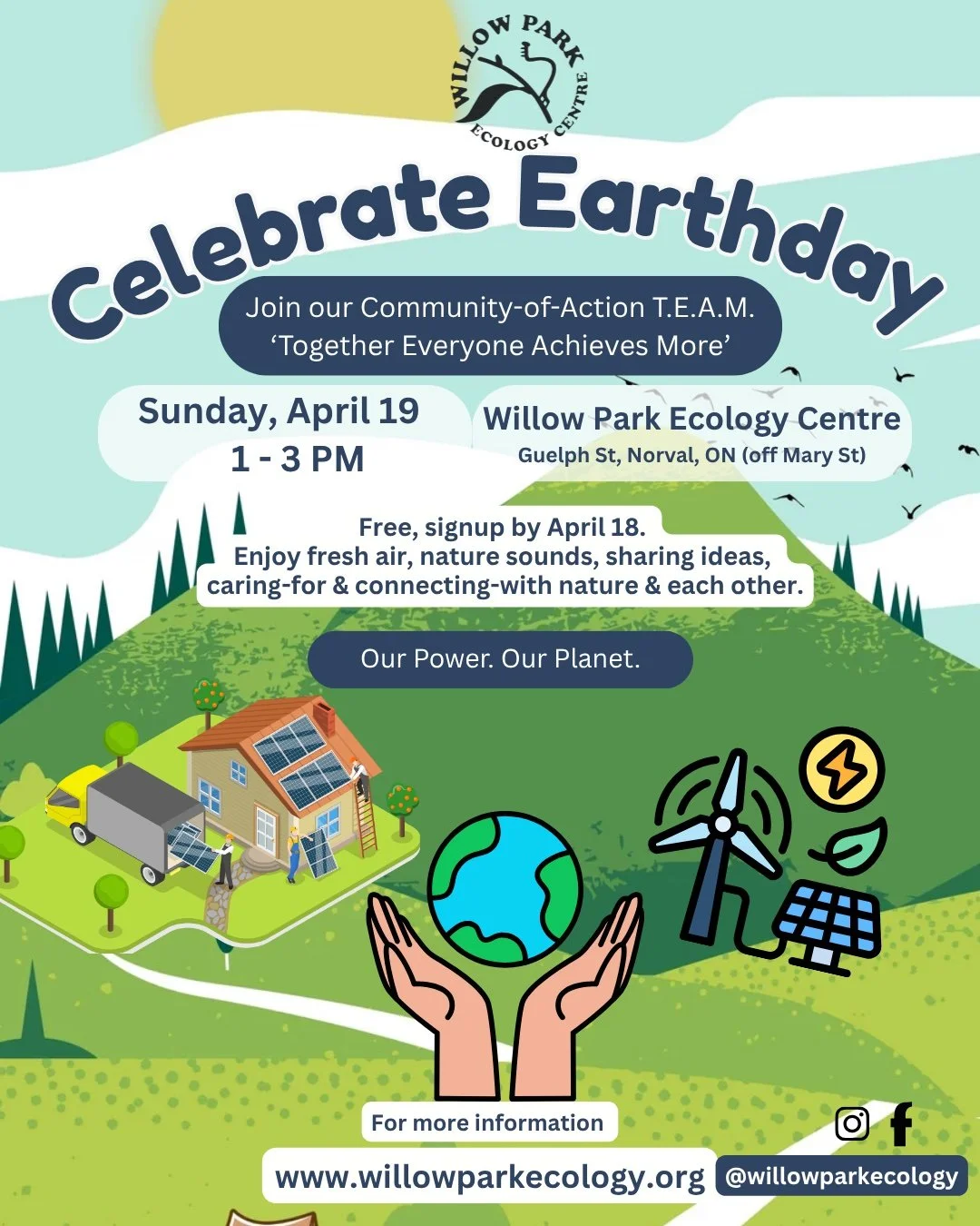 Earth Day at Willow Park Sunday, April 19, 2026 3:00 p.m. 4:00 p.m. Willow Park Ecology Centre Mary Street Halton Hills, ON, L0P 0A2 Canada (map) Google Calendar ICS